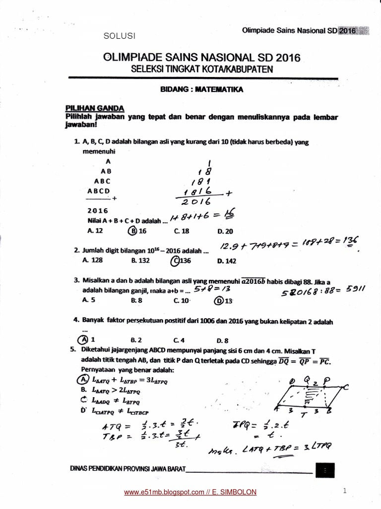 Kompetensi sains nasional diikuti oleh siswa siswi dari jenjang sd/mi, smp, hingga sma. Dari soal soal tersebut tentunya peserta akan dipaksa untuk berfikir menganalisa serta menggunakan segala informasi yang pernah diterimanya untuk menerapkannya dalam memecahkan soal soal yang berhubungan dengan soal soal tersebut. Soal uas kelas 6 tahun pelajaran 2015 2016. Salah satu ciri soal olimpiade matematika menekankan pada pemecahan masalah (problem solving). Soal osn ipa sd 2018 sobat olimpiade mania berikut ini kumpulan soal olimpiade sains nasional osn ipa sd tahun 2018.